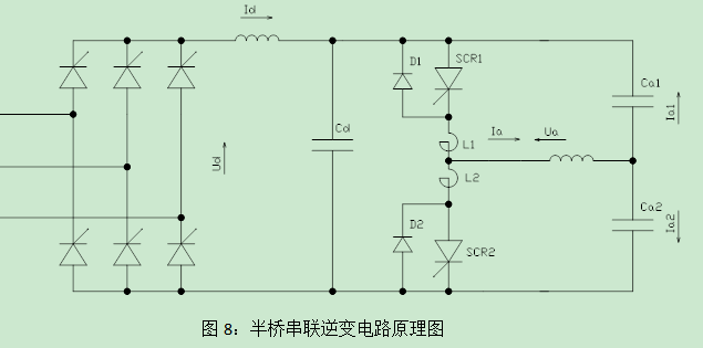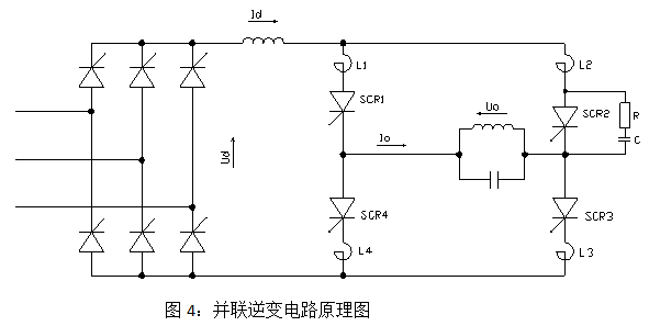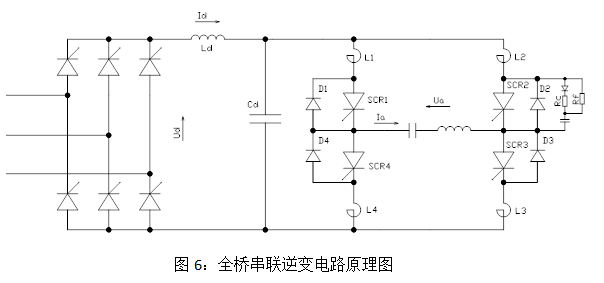 4、SCR串联逆变器的工作原理 4.1、串联逆变电路结构 串联逆变电路的全桥电路结构如图6: 串联逆变电路中主要元件的电气特性与并联逆变电路成镜像关系,分述如下: 滤波电容Cd: 滤波电容Cd...
